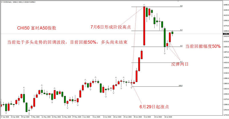 中国十年期债券收益率走势图与A股市场走势存在一定程度的共振性,背后的逻辑依据是上市公司的净资产收益率平均水平和债券长期收益率存在正相关关系。自4月29日开始,债券收益率开启上行波段,自最低点2.503%上涨至7月9日的3.2% 。之所以能够在疫情的阴霾之下保持利率上升,是因为中国对疫情的处理坚决果断,是全球典范。因此,现阶段中国经济相比海外国家存在巨大的比较优势。但是,在7月9日之后,债券收益率开始向下调整,这代表避险情绪在不断升温。之所以把本次下跌看做调整走势,是因为中国统计局公布的二季度GDP增速为正增长3.2%,超出市场预期,代表宏观经济进一步好转。