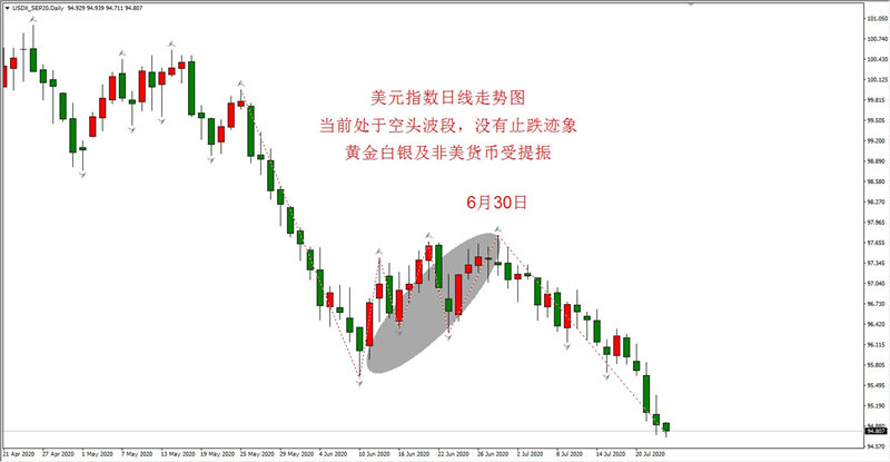 图1,美元指数日线级别走势图短线看空,当前连续五根阴线,空头动能强盛,没有止跌迹象。利好黄金白银及非美货币。
