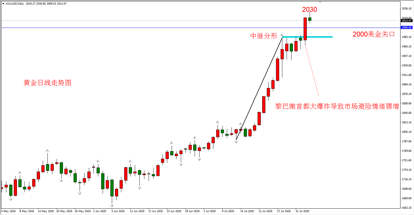 其实昨日美元指数仅仅收出小阴线,并未大跌,EURUSD也仅仅上涨81标准点。造成黄金昨日大涨的主要因素,或许就是消息面里黎巴嫩首都贝鲁特硝酸铵库爆炸事件。虽然该事件已经证明为“化学物品存储不当”导致的偶然事件,但美国总统特朗普却第一时间站出来讲这可能与“恐怖袭击有关”。要知道,黎巴嫩的周边国家是叙利亚、巴勒斯坦、以色列等等,都是中东的“刺头”,所以该国处于非常敏感的地带,引起黄亚汇资市场的巨大恐慌也是情理之中。预计随着该事件热度的消退,黄金将会回吐前期涨幅,也就是说,笔者依旧维持对黄金“高位筑顶”的基本判断。