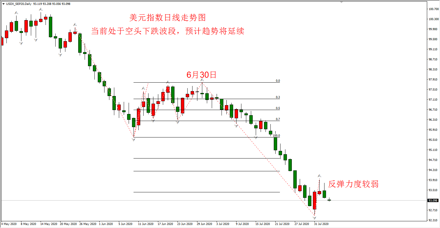 基本面角度考虑,美国二季度GDP增速年率为-32.9%,三季度预计也会非常差,因为特朗普当前的注意力依旧在争取连任上面,而非疫情管控和经济复苏。本周五将会有7月份非农就业报告公布,由于上次大非农新增就业人数超预期增长250万人,所以市场普遍预计本次新增就业也将出现正增长。综合来看,本次大非农将利多美元,7月31日低点基本便是近期支撑位,也有可能成为美元指数下跌减速的重要标志。