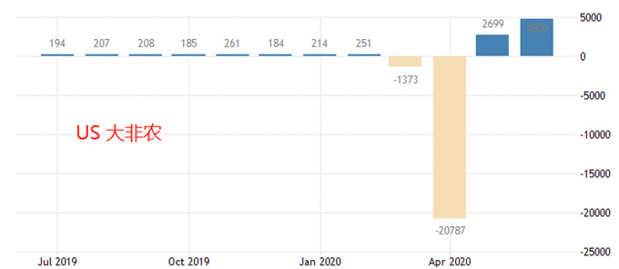 周三小非农不及预期,预计大非农也讲利空美元。新增非农就业人数,前值增加480万,预期值增加148万人,笔者预计公布值在240万以下的概率较高,也就是前值折半。7月份的热点事件当中,中美互关领事馆最为引人注目,这会激起市场避险情绪,利空美国经济。失业率前值11.1%,预期值10.6%,小幅降低,但依旧处于5%充分就业水平之上。毫无疑问,美国的宏观经济还没到复苏的时候,反映到美元指数当中,下跌趋势仍将延续。