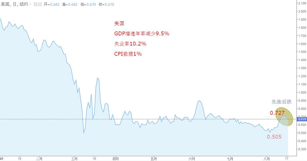 十年期美债在8月13日达到阶段最高点0.727%,当时我们在汇评当中提到美债与黄金的关系,并给出结论:美债收益率继续上行,则黄金继续下跌;反之则黄金转势上涨。现在结果出来了,美债并没有延续强势,截至目前已经下跌至0.667%,美元指数也从93.86跌至92.46(依旧处于震荡区间之内),金银和非美则双双大涨。