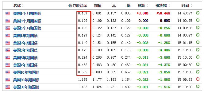 从上图可以看出,10年期以下的美债收益率都低于1%,代表美国经济在未来相当长的时间内都以低增速发展;30年债券收益率也没能突破2%,代表美国债券市场将维持较长时间的低利率。
