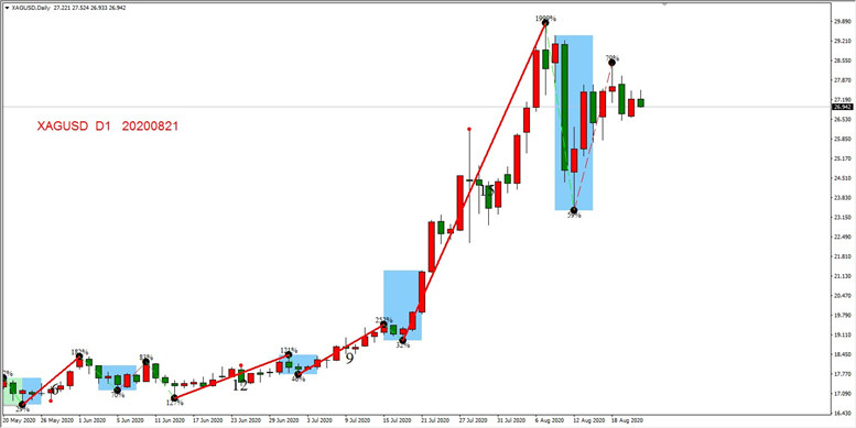 7月17日至8月12日,白银日线形成回撤勾形,左侧上涨波段消耗K线总数15根,符合趋势特征,右侧回撤百分比为59%,达到充分回调的要求。然而勾形结束之后的上涨波段表现一般,第一是持续了五根K线,没有形成趋势;第二是没有突破前期高点29.83美元/盎司。整体来看,这是一个失败的勾形的结构。由于最近的两个波段均为细线,也就是没有达到6根K线的最低波段要求,所以判定未来行情走出震荡结构的概率比较高。
