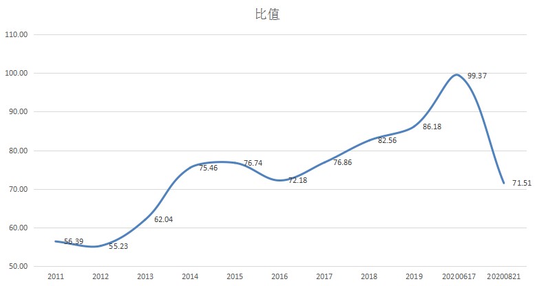 另一方面,黄金比价在疫情过后随机出现大幅下跌,目前处于70水平。比值大降的主要原因,是在7月份的金银同时大幅飙涨的过程中,白银的涨幅远远大于黄金。具体来看,黄金涨幅16%,白银涨幅却高达54% 。