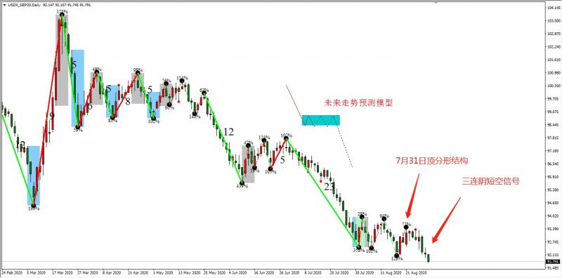 八月初对美元指数的判断是:先走五浪调整结构,之后开启新一轮大跌行情。7月31至8月21日的行情已经印证了五浪调整,7月31日形成的顶分形结构是不错的参与空头方向的时机。上周五、本周一和本周二,美元指数日线级别形成三连阴短期空头信号,对应EURUSD日线形成三连阳多头信号,表明目前市场看空美元情绪浓厚,八月初的判断或将得到验证。
