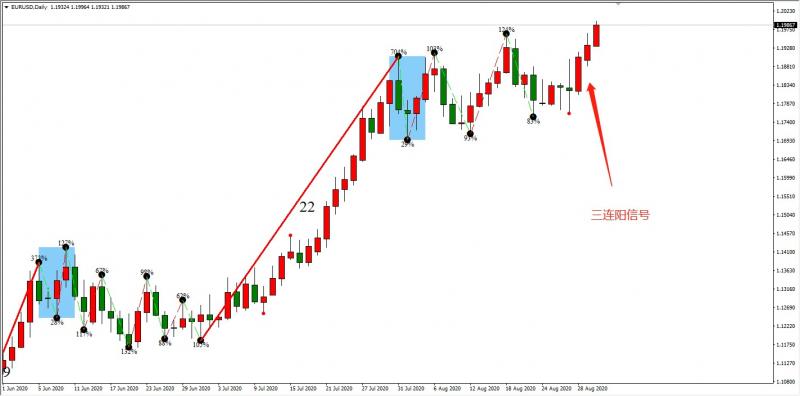 欧元走势与美元相反,目前形成三连阳看多信号。当然,目前美元和欧元都处于震荡状态之中,虽然EURUSD已经突破前期高点1.1964,但也可能是假突破,入市还需谨慎。