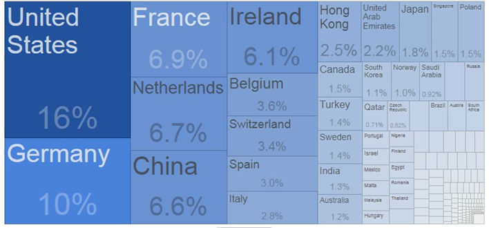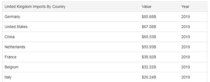 英国前三大进口国家为德国、美国和中国,占比分别为13%、9.9%和9.7% 。德国作为欧盟的主要经济引擎,同时也作为英国商品最大进口来源地,如果因为英欧自由贸易谈判而和英国提高相关贸易关税,那对英国经济的伤害是显而易见的。