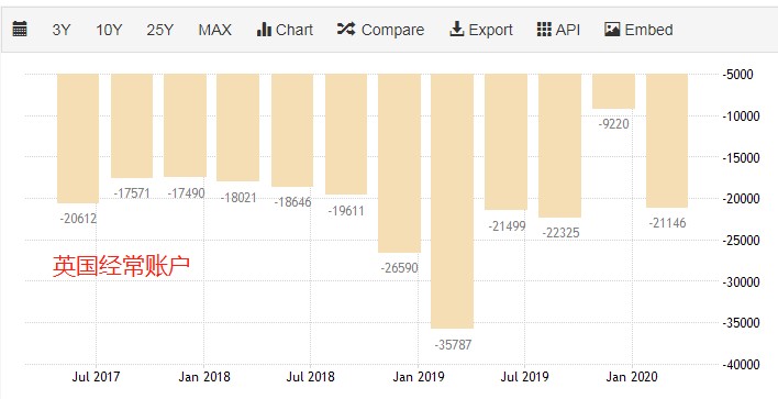 英国经常账户处于贸易逆差状态,最新一期数据为逆差211亿英镑,相比前一期92.2亿英镑具有明显放大。因为新冠肺炎疫情的影响,各国贸易账户数据都有所趋坏,但英国的贸易逆差已经维持二十多年,可以说是英国的先天劣势之一。英国6月份出口数据回升13.1%,达到512亿英镑规模,四月份最低为444亿英镑。6月出口数据同样大幅回升,增幅高达21.9%,至459.5亿英镑。同样的,六月份整体处于贸易逆差状态。逻辑上讲,英镑贬值有利于贸易逆差收窄,这也是特朗普对美元所采取的措施。但由于世界各国都在保持极端的量化宽松政策,所以想要实现本币顺利贬值,并非易事。