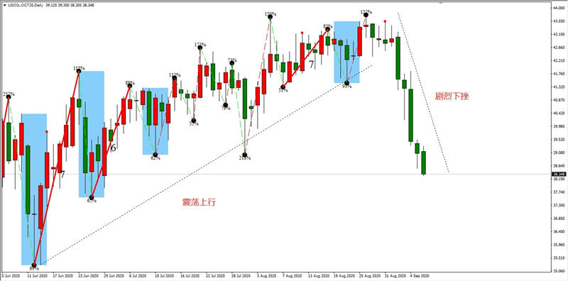 美原油持续将近三个月的震荡上行行情,决定了其必定会有大幅回调,如今得到应验。早在七月份的汇评分析中,我们就已经提出“原油会随着疫情影响衰减而逐步上行,但只有在充分回调之后才会开启健康上涨”的观点。