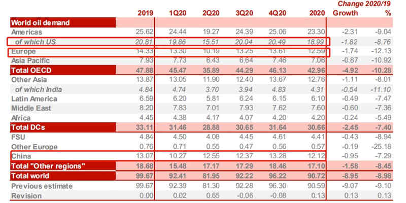 全球消耗石油总量最大的国家,由高到低排序,分别为美国、欧洲、中国,其原油日消耗量分别为2081万桶、1433万桶和1307万桶。中国和欧元区的消耗量差不多,美国一家独大。当前原油价格之所以不能回到疫情之前的70美元/桶,就是因为美国和欧元区的原油消耗没能恢复。可以看到,中国二季度原油消耗1255万桶,相比2019年已经相差无几;美国二季度原油消耗1551万桶,相比2019年减少了将近500万桶,也就是25% 。欧元区二季度消耗原油1019万桶,相比2019年减少400万桶左右,大概33%的幅度。OPEC月报当中对于未来欧洲和美国原油需求恢复较为乐观,可以看到美国四季度消耗2049万桶,欧洲消耗1361万桶,预计均将出现大幅回升,利多油价。