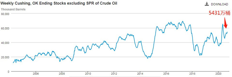 2020年EIA原油库存最低值出现在1月份,为3488万桶;最高值出现在5月份,为6544万桶;最新库存在5431万桶,接近2020年峰值水平。
