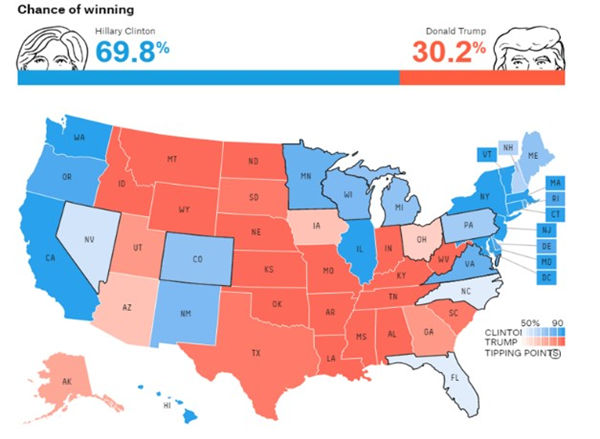 但是,2016年的美国大选早已落幕,全世界都清楚最终的结果是什么——“疯子”特朗普当选美国总统!“精英”希拉里却黯然退场。现实的走向和舆论的引导完全不同,即便当时各大媒体的民调数据都显示希拉里会轻松赢得大选,但民调毕竟只是民调,民调的结果仅仅只是作为参考,可信度不高。如果盲目详细民调数据,最起码在2016年的投资市场里,会被美元和黄金的超预期走势无情嘲弄。(下图为2016年大选前民调数据)