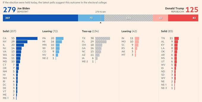 2020年美国总统大选将会在今日(11月3日,周二)正式开启投票,预计将会在11月4日亚盘时段完成计票,并公布统计结果。金融时报给出的民调数据显示,拜登拥有207张坚定选票和72张倾向性选票,总计票数279,高于当选总统的270票最低门槛;特朗普拥有83张坚定选票和42张倾向性选票,总计票数125。即便把134张摇摆选票全部算作支持特朗普,他也仅仅有259张选票,不但远低于拜登选票,还达不到270票的最低门槛。(金融时报数据见下图)