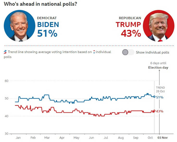 无独有偶,英国广播公司给出的民意调查结果显示,拜登在今年年初至今的支持率大部分时间都维持在50%以上,最新值为51%;特朗普至今的支持率大部分时间维持在50%以下,最新值为43% 。可以看出,BBC和金融时报一样,都认为拜登击败特朗普并当选美国总统已经是板上钉钉的事情。毕竟,特朗普执政的四年里,在国际社会四处树敌,先是和欧洲各国关系搞僵,之后与亚太各国进行激烈的贸易摩擦,最后在新冠肺炎疫情冲击之下,让全美24万民众丧生。这些负面政绩,不得不让人唏嘘。(BBC数据见下图)