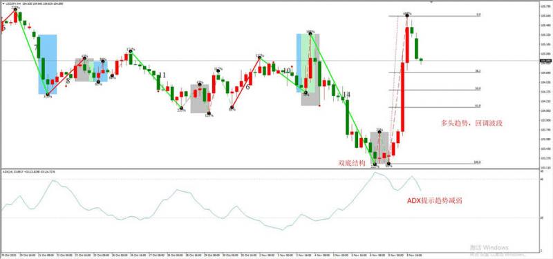 勾形理论:前期的双底结构对行情构成技术支撑,但这并不是行情上涨的根本原因。疫苗研制公司辉瑞宣布研发成功疫苗,并且有90%的有效性,这大大刺激了市场对美国未来经济复苏的乐观预期。在美元指数大涨的状态下,日元受到压制,被迫贬值。技术面考量,支撑位在104.69位置,如果出现纠结走势,则支撑位确认。若否,则继续下行,第二支撑位104.40