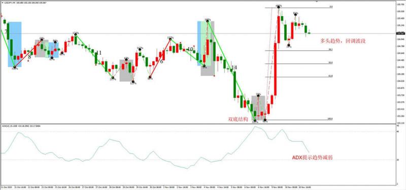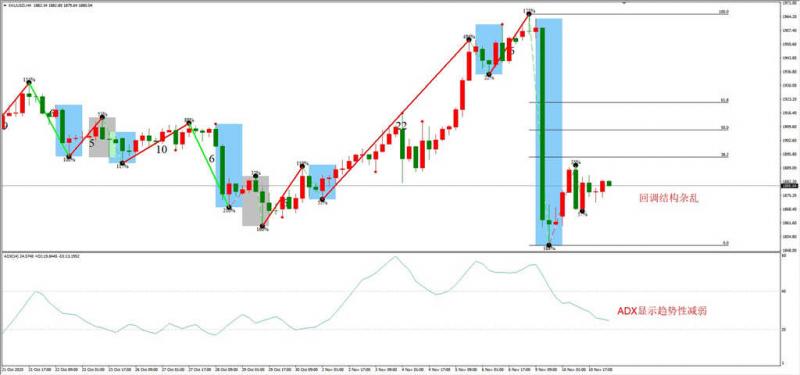 综合判断:短线看震荡,重心将会上移。ADX数值较低,代表当前行情走势不激烈,偏向震荡。宏观面来看,辉瑞疫苗研制成功,美国大选尘埃落定,双重利好将会压制黄金多头走势。消息面的分析并不能完全指导投资,黄金的中长期趋势还是由美联储货币政策决定。在市场乐观预期浓厚的情况下,预计美联储不会再次开启降息政策,货币敞口也将维持现状。在没有更多美元发行出来的情况下,美元指数将会自动升值。所以,笔者对中长期黄金的走势较为悲观,预计以空头为主。
