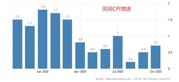 2020年10月,英国的年通胀率从9月份的0.5%升至0.7%,高于0.6%的预期。这是三个月来最高的数据,同时服装价格反弹(0% vs -1.5%9月份);食品(0.6% vs -0.1%);家具、家具和地毯(0.1% vs -0.5%)。运输价格涨幅较快(1.2%比0.9%);以及杂项商品和服务(0.8% vs 0.7%),娱乐和文化支出下降(2% vs 2.4%),住房和公用事业支出下降(-1.3% vs -0.9%)。从月度环比来看,消费者价格指数在9月份上涨0.4%后停滞不前,而市场预期为下跌0.1%。虽然从趋势看英国CPI在不断走高,但由于绝对值依旧远低于2%的温和通胀水平,所以其经济复苏进程依旧很慢。