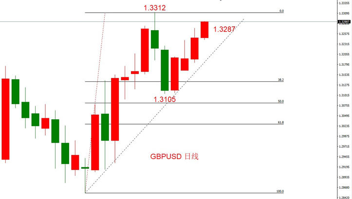 英镑日线级别多头回撤勾形稳固,右侧回撤波段已经结束,最低跌至1.3105,该位置处于0.382~0.5之间,目前已经成为多头支撑位。市价1.3287,距离支撑位空间182点;上方阻力位1.3312,空间25点,做多盈亏比为0.137,较低,但胜率较高,达到87.9% 。综合判断,短线看多,上破前高的可能性很大,密切关注突破高点后是否出现走势纠结。