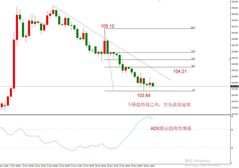 勾形理论:空头波段延续,只要运行在趋势线之下,就不会改变趋势方向。当前市价103.76,上方有效阻力位105.12,但由于该阻力位太高,所以使用0.382分位104.21,市价到阻力位空间45点;下方支撑位103.64,空间12点,盈亏比0.266,胜率78.98% 。