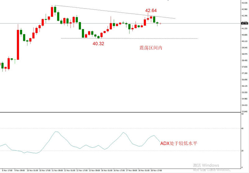 ADX观点:最新值27.76,较低水平,趋势性较差,走势流畅度较差。勾形理论观点:原油走势已经趋向震荡,上方阻力位42.64美元,下方支撑位40.32美元。需要说明的是,当前的下降趋势线可靠性不高,因为42.64高点刚刚形成,还没有经过足够时间的验证。