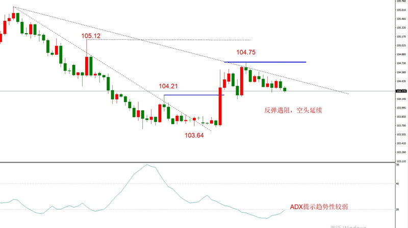 勾形理论:空头趋势不变,只是经历反弹波段之后,下降速率从高速减为中速下跌。最新趋势线如图,上方阻力位104.75,市价104.27,空间48点。下方支撑位103.64,空间63点,盈亏比较为合适。需要提醒的是,当前的下跌波段流畅度较差,有可能转变为横盘震荡。