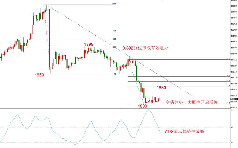 勾形理论观点:黄金在中等区间震荡一段时间后终于迎来突破,1850重要支撑位已经被有效突破,下方没有明显重要支撑位,预计空头波段将会持续较长时间。最新的几根小阳线,或许代表行情已经出现了反弹的动能,但只要不突破图中的下降趋势线,空头趋势就将延续。未来大概率开启反弹波段,第一阻力位在前期下跌波段的0.618分位的1830美元。