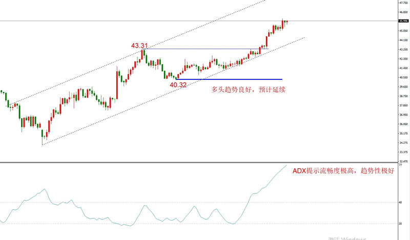 勾形理论观点:处于多头趋势线之上,第一阻力位43.31已经被突破,上方不存在其它明显阻力,上涨空间较大。下方支撑位40.32,短时间内不会被突破。未来可能会面临回调,但只要不突破趋势线,则多头波段延续。