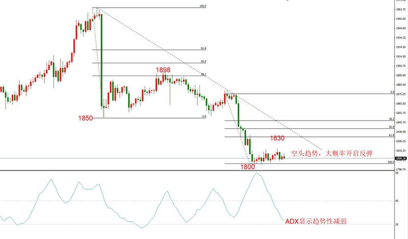勾形理论观点:最新的几根K线表现出横向震荡的状态,下方支撑位1800美元,预计将开启反弹,只要反弹不突破图中的下降趋势线,空头趋势就将延续。第一阻力位在前期下跌波段的0.618分位,价格为1830美元。