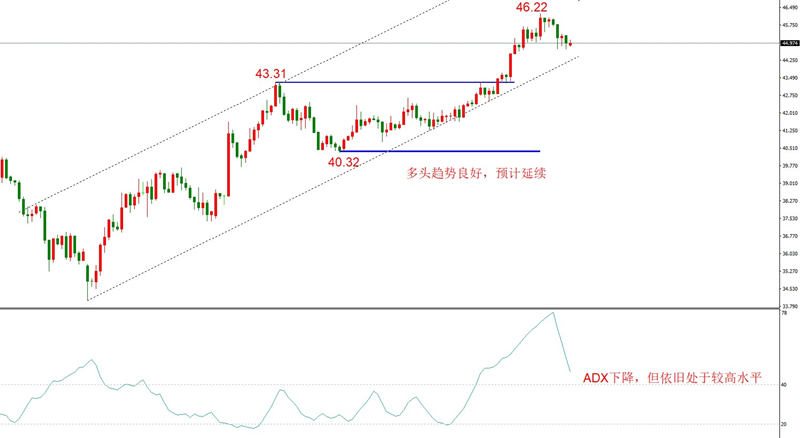 勾形理论观点:上方阻力位46.22形成,当前处于回撤下跌波段,只要不跌破上升趋势线,则多头延续。当前上升趋势线经过了三个中期低点验证,比较可靠,预计将形成有效支撑。