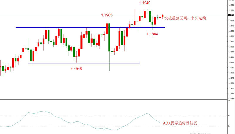 勾形理论观点:震荡区间上沿1.1905已经被有效突破,当前处于上涨波段,在下一个顶分形出现之前,维持看多观点。上方最新阻力位1.1940,市价1.1918,还剩22点,被突破概率较高。需要提醒的是,美元指数还没有有效突破震荡区间,所以EURUSD的上行空间还不能明确判断。一种较坏的情况是,美元指数在底部91.7附近获得支撑开始上涨,届时EURUSD将受阻下跌。