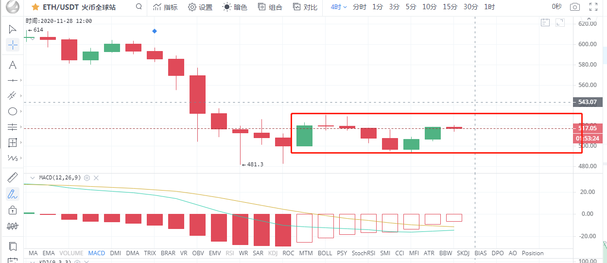 以太坊行情分析:以太坊联动比特币凌晨下跌至493一线后反弹上行,并未继续走低,目前运行在517一线附近。从四小图看,布林带张口运行,5日均线与10日均线平行运行,附图MACD双线死叉在零轴下方运行,红色动能柱持续缩量,KDJ三线金叉向上运行。综合来看,行情预计维持在490-530区间整理。操作上高空低多。