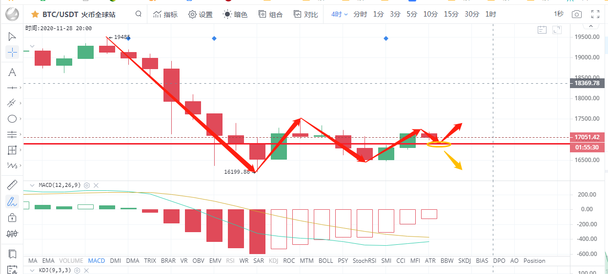 比特币行情分析:从日线上看,昨日收取一根小阴线,昨日行情向上反弹虽然突破中轨但并未企稳,引发二次小幅跳水,再度下跌,但并未跌破日线30日均线支撑,下方30日均线支撑还是较为强烈的。由于感恩节国外放假,灰度等机构休息对比特币暂停加持,ok开放提币,大量资金流出,在双重影响下导致币价大幅跳水,目前市场还是处于一个恐慌期,日线上关注比特币能否再度突破企稳中轨,若企稳,行情的多头能量再次被激发,将继续上探。反之还有继续走低的可能。日线上关注上方压力位17800,下方支撑位16200.