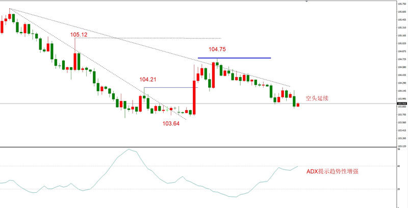 勾形理论:空头趋势不变,只是经历反弹波段之后,下降速率从高速减为中速下跌。最新趋势线如图,上方阻力位104.75,市价103.90,空间85点。下方支撑位103.64,空间26点,盈亏比较为合适。需要提醒的是,当前的下跌波段流畅度较差,有可能转变为横盘震荡。