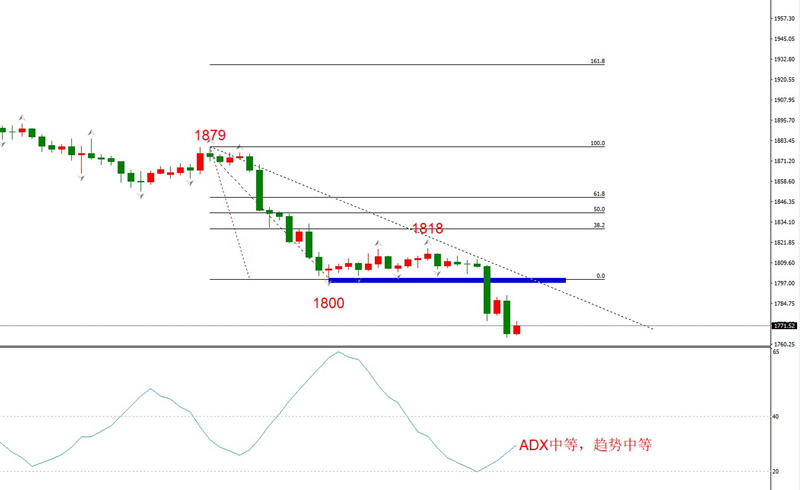 勾形理论观点:当前处于下跌波段,且处于下降趋势线左侧,空头将延续。在突破1800美元支撑位之后,下方就不再有明显的阻力位,下行空间较大。需要提醒的是,黄金日线级别也处于空头趋势,1800不单单是H4重要支撑位,也是日线级别重要支撑位。