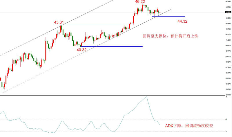 勾形理论观点:目前上升通道线依旧有效,回调波段已经触及下轨支撑,预计将开启上涨波段。下方支撑位在44.32附近,市价45.05,空间73点。上行第一目标位46.22,空间117点。