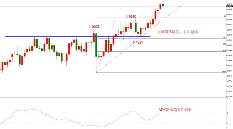 勾形理论观点:震荡区间上沿1.1905已经被有效突破,当前处于上涨波段,在下一个顶分形出现之前,维持看多观点。第一阻力位1.1940已经被突破,上方没有明显的第二阻力,在顶分形出现之前,维持看多观点。美元指数也已经突破震荡区间下沿91.70,预计将开启较大规模的空头走势,这有利于EURUSD的多头延续。