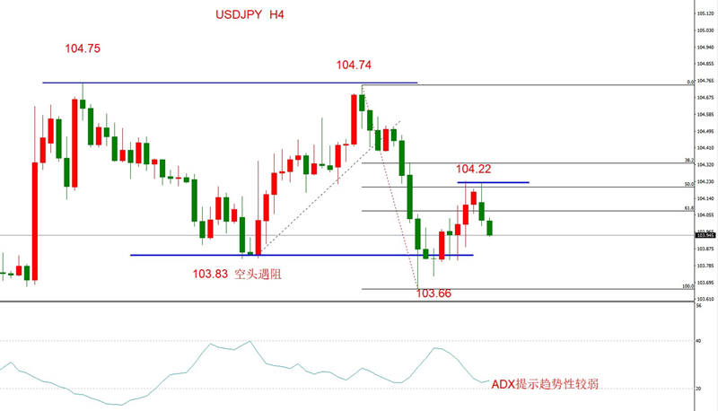 勾形理论:大的震荡区间没有改变,最新的上涨波段在没有触及104.74上沿之前就遇阻回落,最新支撑位104.22,目前看来有效。从走势结构来看,美日四小时级别已经形成不错的勾形回撤结构,左侧下跌波段为104.74~103.66,右侧反弹波段为103.66~104.22,最高反弹在50%附近。