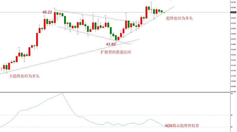 ADX观点:最新值50.46,极高水平,下行状态,趋势性依旧极好。勾形理论观点:多头趋势未改,当前只是适当的调整,调整到位后仍将上涨。50%附近都是健康的回调区间,当前回调幅度还太小,预计底部支撑1.2109预计将会被突破。左侧上涨波段K线总数22根,如果回调幅度不够,但持续K线总数达到11根左右,也可以认为充分回调,可以开启上涨。当前回调波段K线数5根,远未达到标准。