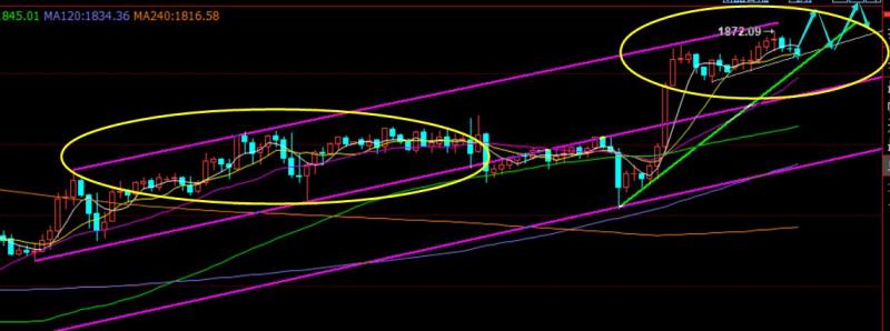 第三,日线级别,三连阳之后,上周五收报高位十字K,而昨日可以说是一次完美的上下大洗盘,先急跌跳水破位十字K低点,再V型上涨突破十字K高点,大阳再次出现,短期走势就偏强运行,回测多跟随为主;同时,趋势压力也在1875一线,它能否突破站稳,决定能否进一步强攻上行;反之,可能会再次步入高位的墨迹震荡,酝酿背驰走法,再伺机酝酿拉升破位,类似上周四至本周一的走势;
