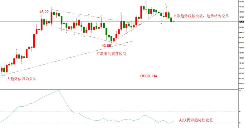 勾形理论观点:原油再次上涨的力度非常弱,现在又突破了上升趋势线,预计趋势已经由多头转换为空头。之所以不认为当前的下跌为回撤,是因为前期上涨波段并没有明显的趋势特征。