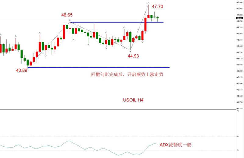 勾形理论观点:前期的回撤勾形形成后,直接开启了当前的上涨波段。最新上涨波段为44.93~47.7,从最近的几次K线来看,大概率开启回调波段。前期的阻力46.65已经转换为支撑,预计本次回调不会持续较大幅度。
