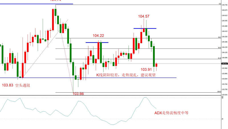 勾形理论:日元最近的走势就是大震荡之后小震荡,小震荡之后再大震荡,完全没有表现出良好的趋势性。当前处于下跌波段,即将到达103.83支撑位置,预计不久将开启新的反弹走势。