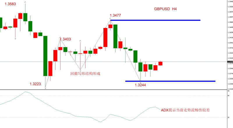 勾形理论:英镑的走势结构要比欧元清晰的多,上方1.3477阻力,下方1.3244支撑,由于区间较小,所以就不再用黄金分割比例寻找细分的支撑阻力。目前来看,上涨波段突破1.3477的概率较高。