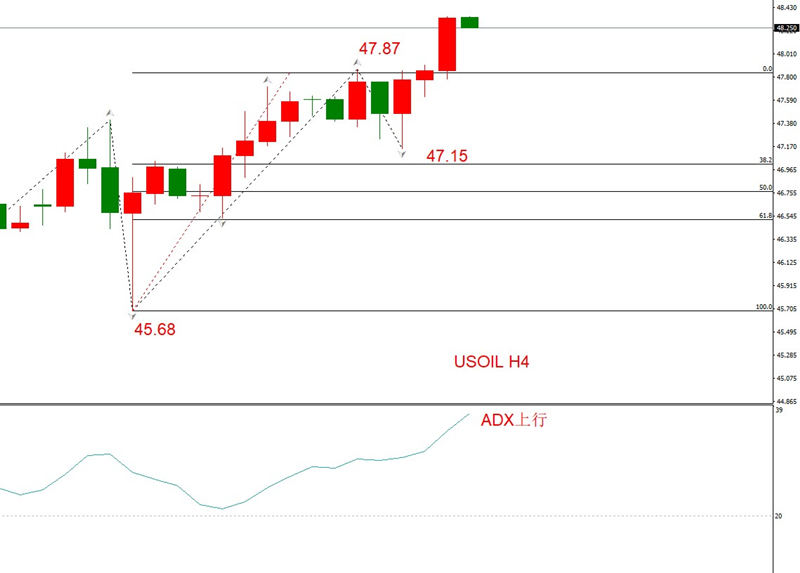 勾形理论观点:四小时级别已经突破47.87阻力位,且上行幅度较大,确认为有效突破。勾形左侧波段持续11根K线,右侧持续3根,走势较为健康。最大回撤不足38.2%,存在N字型调整的可能性。但由于市价48.27已经远离47.87阻力,所以多头波段还将延续。