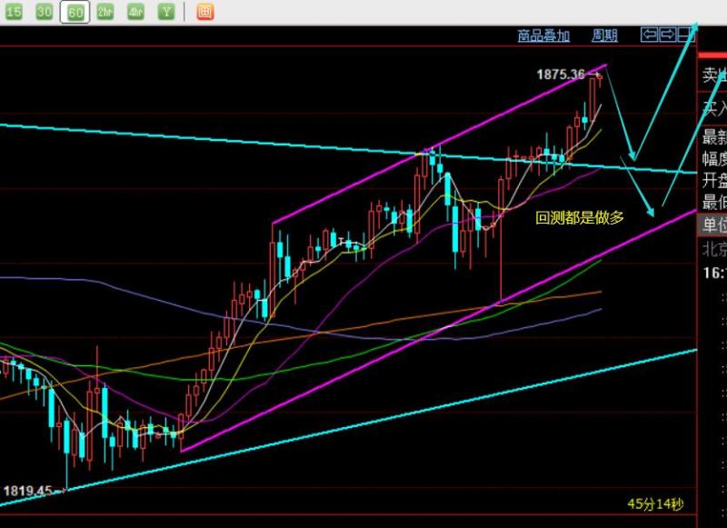 第四,小时线级别,又是循环的走法,隔夜探底拉升回到高点,今日开盘直接上涨,午后回调不大,欧盘继续拉升破高,这样的逼空强势上涨,基本是单边模式,只在于敢不敢直接多的问题;那么当前亚欧盘都拉升了一波,美盘前后就最好不能再去追多博,谨防又出现昨日的走法,跌一波回到起涨点,再拉升回去;因此,起涨是1861,此位置上方,首次能下来都是做多机会,再按照如图短期趋势压力,1876-78存在一定压制,而下方1853 逢低 已经成为极限的较强支撑,触及也是做多为主;
