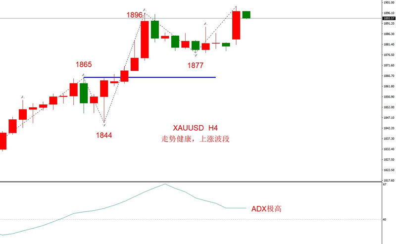 勾形理论观点:黄金近期的走势符合回撤勾形+突破勾形+回撤勾形的循环模式,走势相当健康。当前处于上涨波段,下方支撑位1877,已经突破阻力位1896美元,预计还将进一步上行(欧盘和美盘时段)。