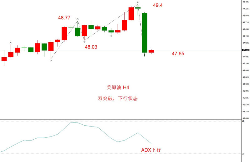 勾形理论观点:原有最终还是没能突破50美元/桶的整数关口,在触及49.4之后随机开启大幅度下跌。近期走势为双突破结构,波动率放大,但趋势性不明。最新波段为下跌,预计将会延续。