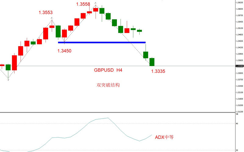 勾形理论:双突破结构,波动率不断扩大。1.3450支撑位在周期开盘被突破,下行趋势明显。对于周一开盘的调控走势,完全出乎笔者的预料,在日线多头的趋势线开盘向下调控,预示着多头趋势即将终结。