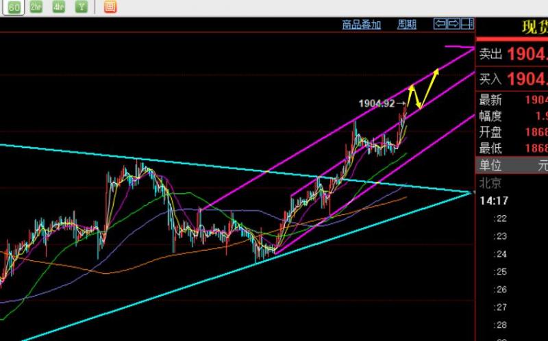 第三,4小时级别,短期守住10日均线,就说明短期走势仍旧是偏强,同时上涨通道保持完好; 小时线级别,早上一波大涨,当午后回调力度不大,欧盘前一定要博一次跟多,盘中周末就计划给出1875多,但早盘最低只是他1881,随后修正策略,给出1892多,可惜只下探1893,两次错过做多时机,就直接强调不等回测了,1899直接看涨,这是典型的强势单边走法; 另外,小时线级别,走的也是一个顶底转换,上周1875前高点突破,随后回测确认依托1877-76续涨;今日1897-96上周高点已经突破,那么接下来思路,以此支撑逢低继续看涨即可,阻力目标可参看以上给出的压力;
